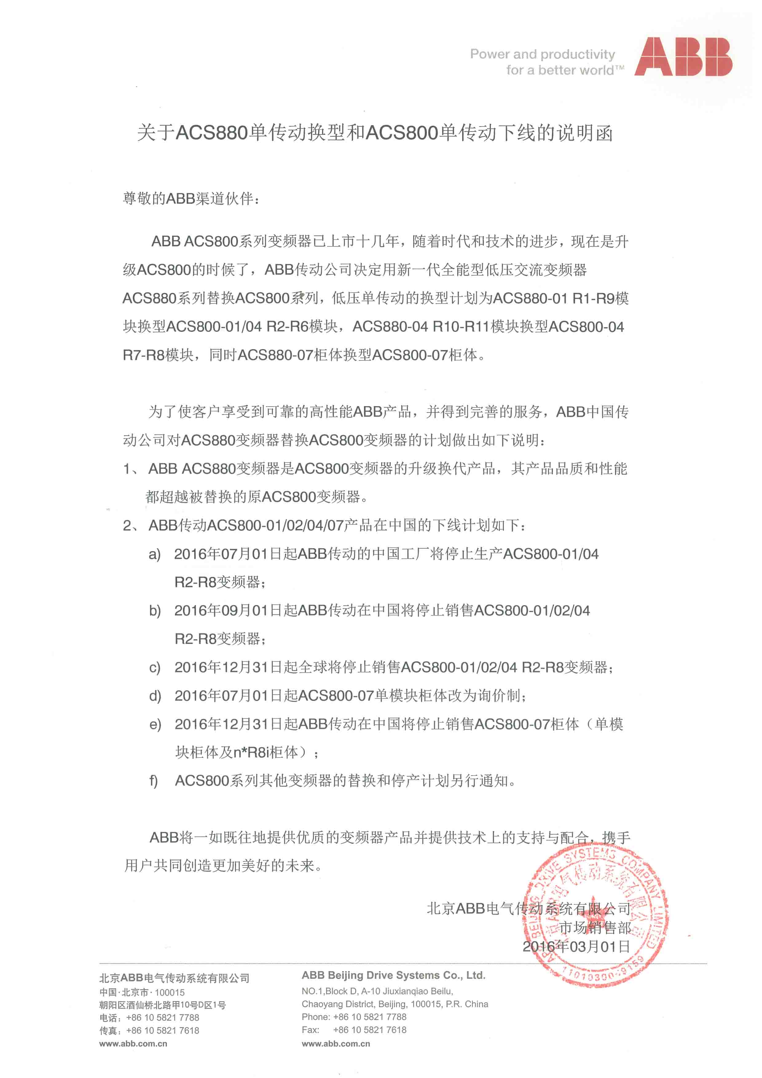 ABB传动关于ACS880单传动换型和ACS800单传动下线的说明函